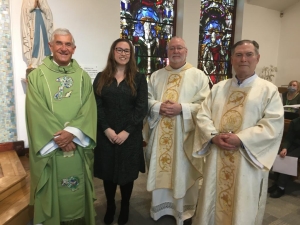 St Patrick’s Day – 17th March – was a special day for the Parish and the School. At the Whole School Mass, teacher, Charlotte Priddle, was received into full communion with the catholic church and, made her First Holy Communion and was confirmed by Canon Gregory Grant. Charlotte has worked in the school for 11 years and for the past year has been acting deputy head. She is pictured with Canon Gregory, Abbot David Charlesworth and Deacon Rob Easton.